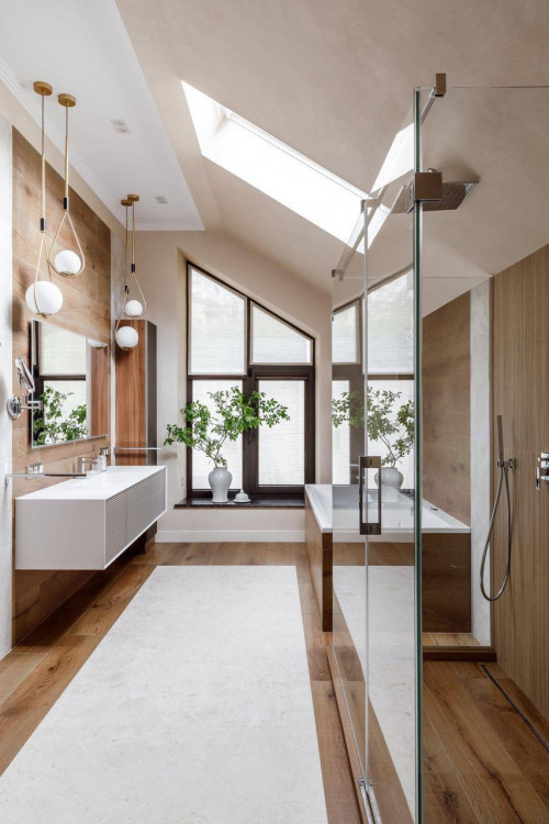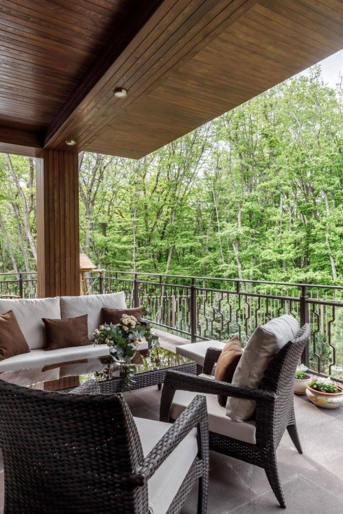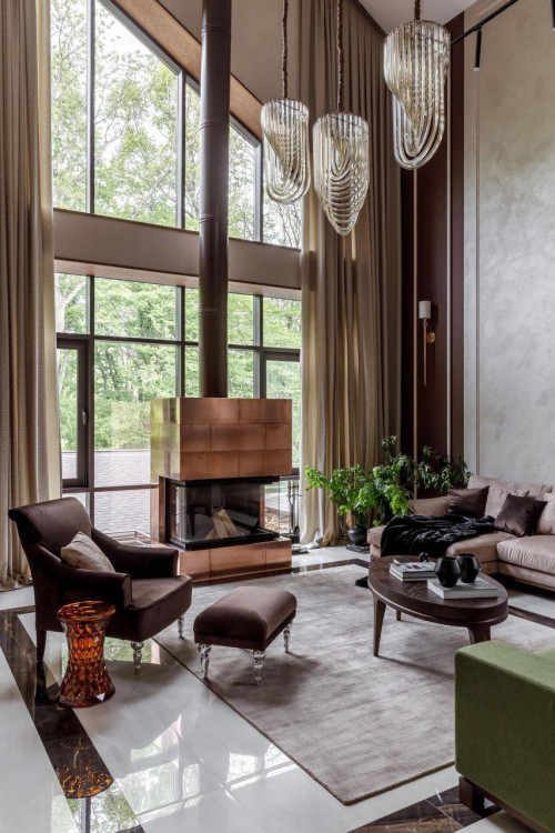 Современный дом с камином и видом на лес